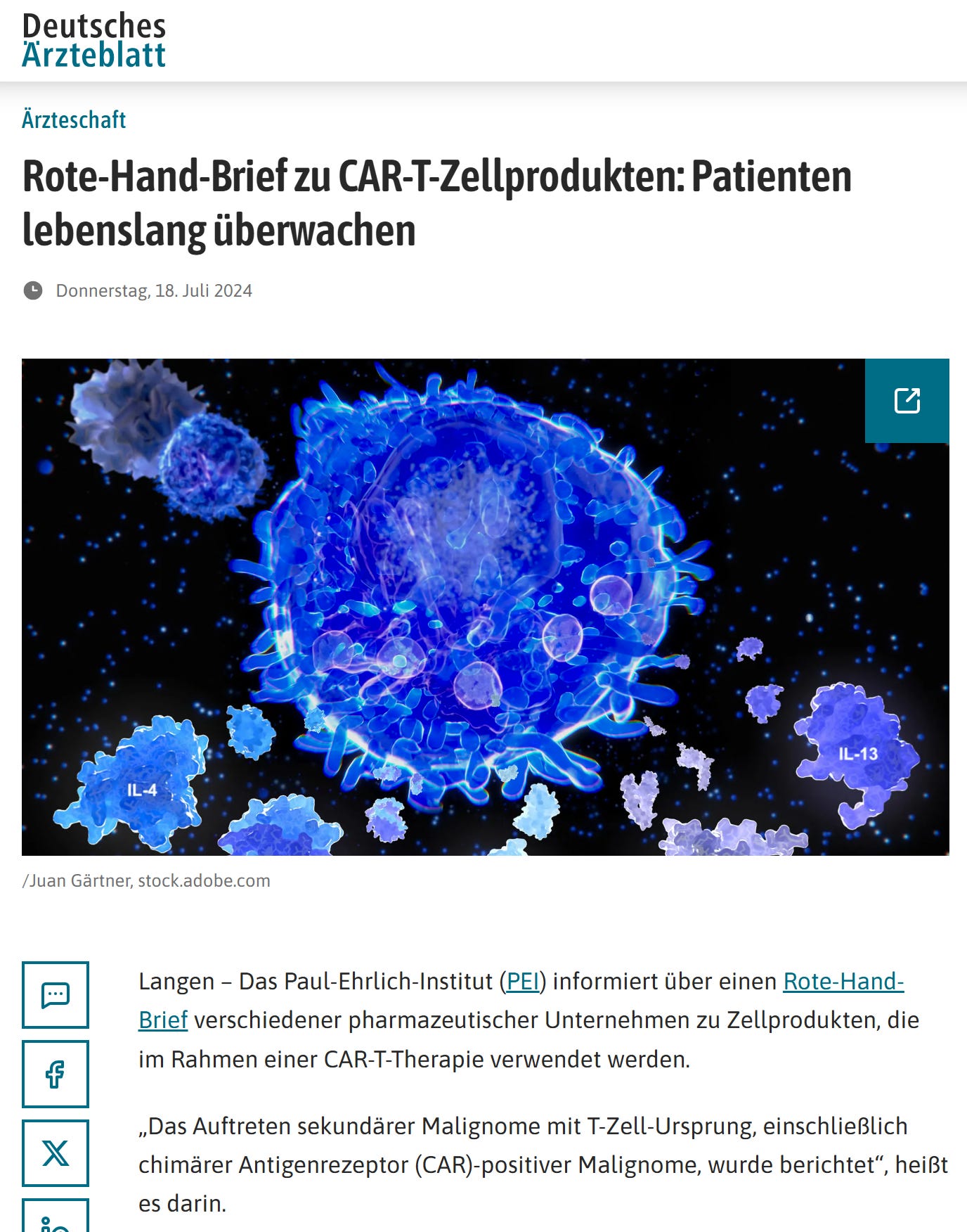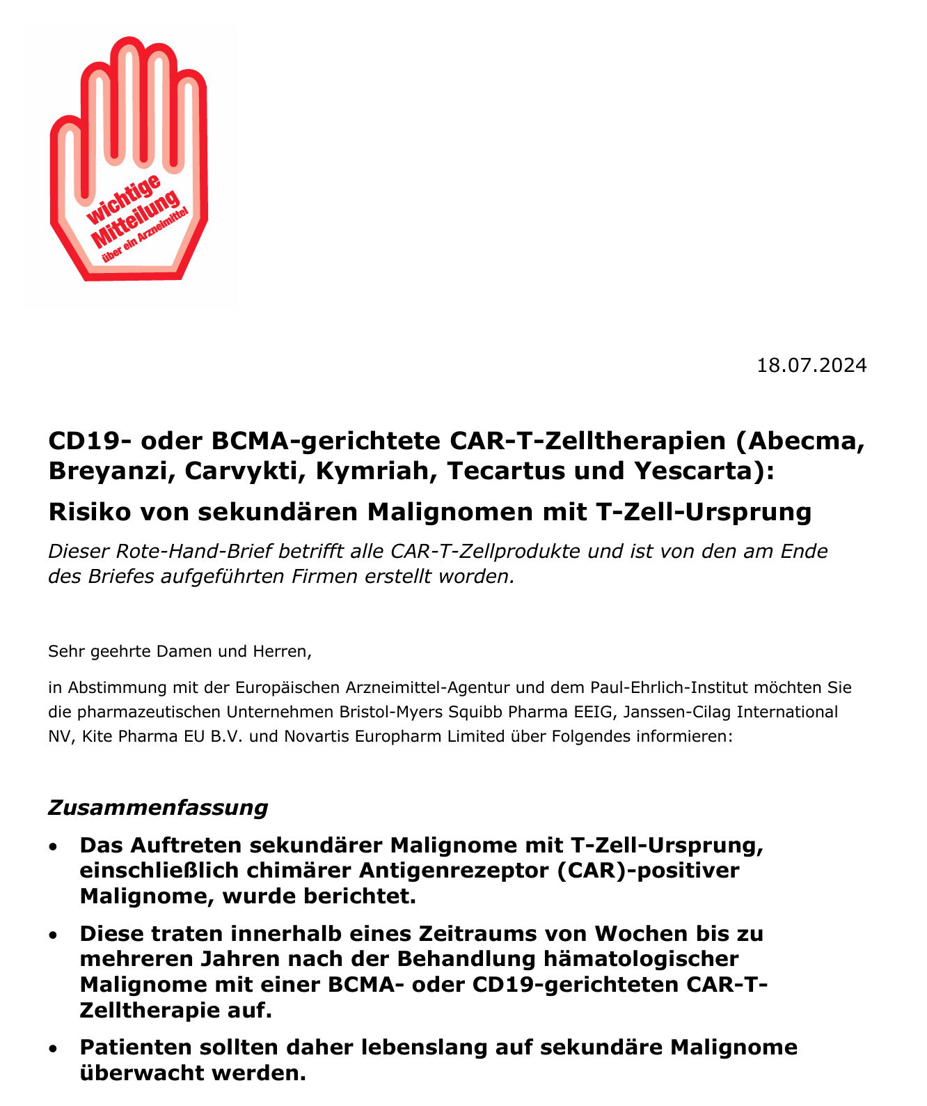 Ärzteblatt, D. Ä. G. R. D. (n.d.-c). Rote-Hand-Brief zu CAR-T-Zellprodukten: Patienten lebenslang überwachen. Deutsches Ärzteblatt. https://www.aerzteblatt.de/news/rote-hand-brief-zu-car-t-zellprodukten-patienten-lebenslang-ueberwachen-522ba4a6-e4e5-4d83-af35-851eea50fe3a