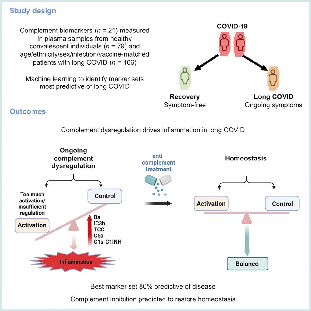Baillie K, Davies HE, Keat SBK, Ladell K, Miners KL, Jones SA, Mellou E, Toonen EJM, Price DA, Morgan BP, Zelek WM. Complement dysregulation is a prevalent and therapeutically amenable feature of long COVID. Med. 2024 Mar 8;5(3):239-253.e5. doi: 10.1016/j.medj.2024.01.011. Epub 2024 Feb 15. PMID: 38359836. https://pubmed.ncbi.nlm.nih.gov/38359836/
