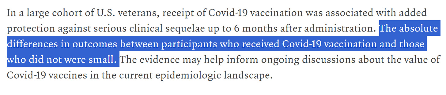 “Die absoluten Unterschiede in den Ergebnissen zwischen den Teilnehmern, die eine Covid-19-Impfung erhalten hatten, und denen, die keine Impfung erhalten hatten, waren gering.”8