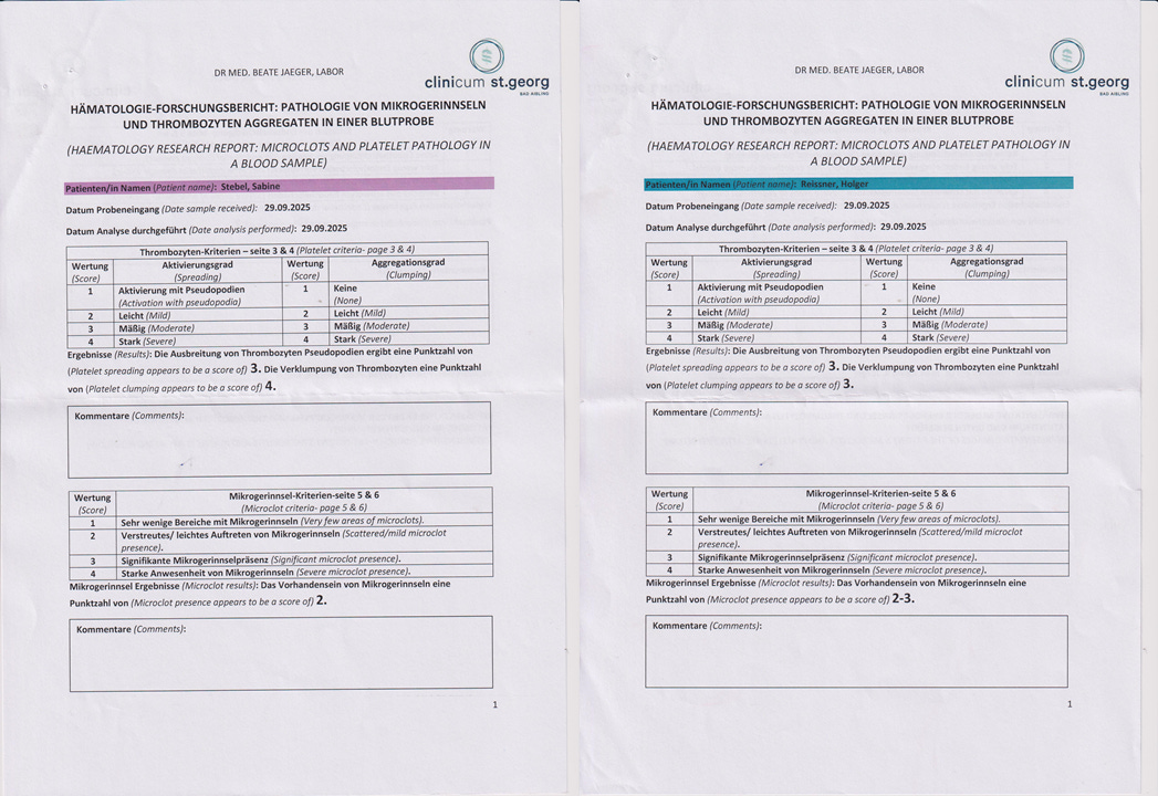 Wir haben beide massive Thrombozytenverklumpungen, ich mehr als Holger.