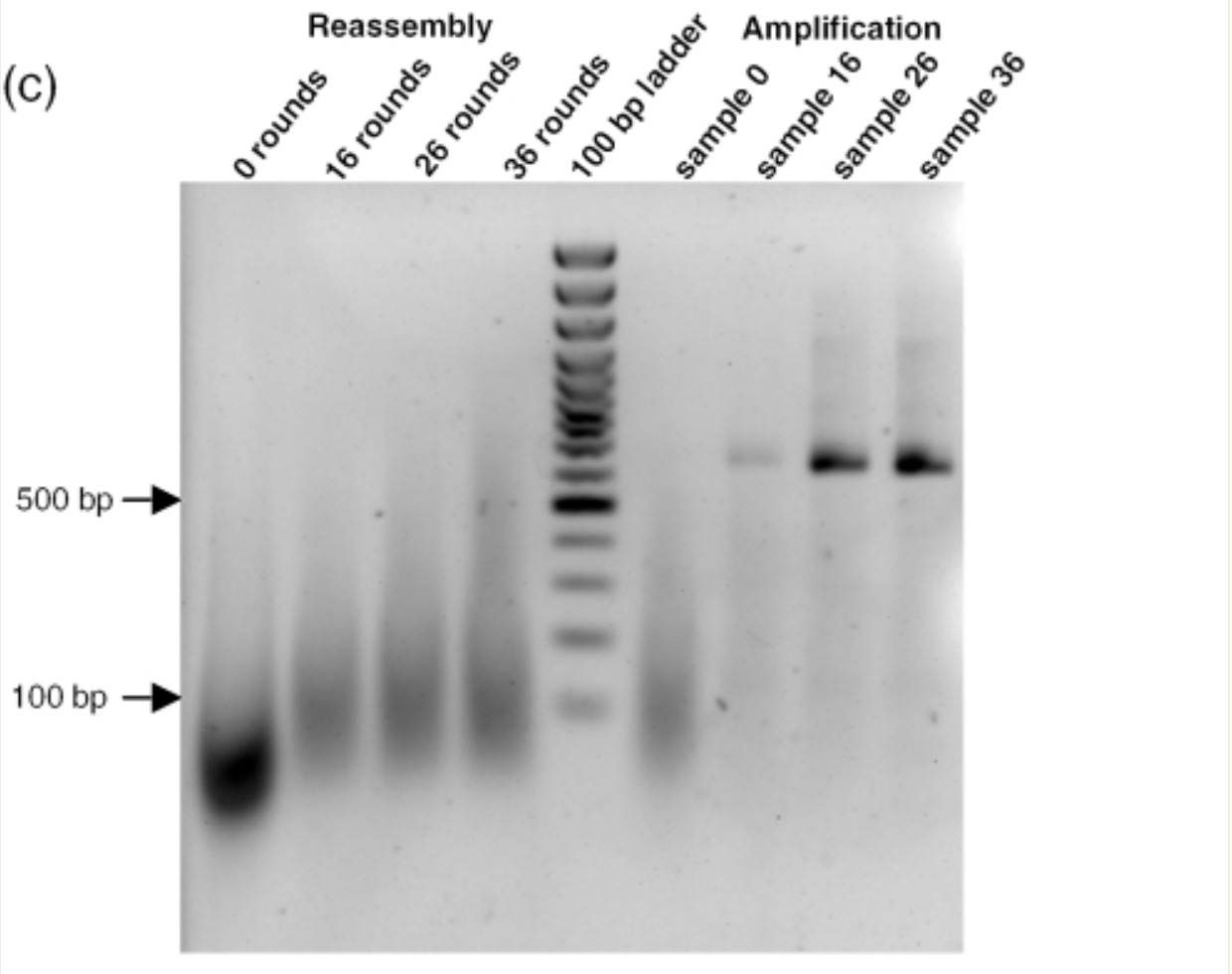 Rechts vom Marker sieht man, wenn man in die jeweilige Mischung von der linken Seite Primer dazu gibt, um das Gen selektiv zu vermehren, dass bereits am 16 runden wieder zusammengesetztes vollständiges Genprodukt vorhanden ist. Ab Runde 26 ist das Gen schon in großer Menge vorhanden und das ganz ohne Primer auf der linken Seite.