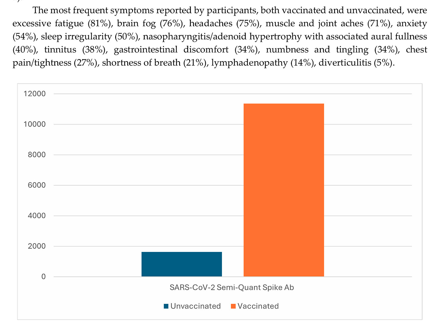 Ergebnisse: Insgesamt wurden 81 Teilnehmer mit Post-Impf-Syndrom und 19 nicht geimpfte Teilnehmer mit Long-COVID-Symptomen untersucht. SARS-CoV-2 Semi-Quant Spike Ab in der geimpften Kohorte zeigte ein durchschnittliches Ergebnis von 11356,86, während SARS-CoV-2 Semi-Quant Spike Ab in der ungeimpften Kohorte ein durchschnittliches Ergebnis von 1631,94 zeigte.