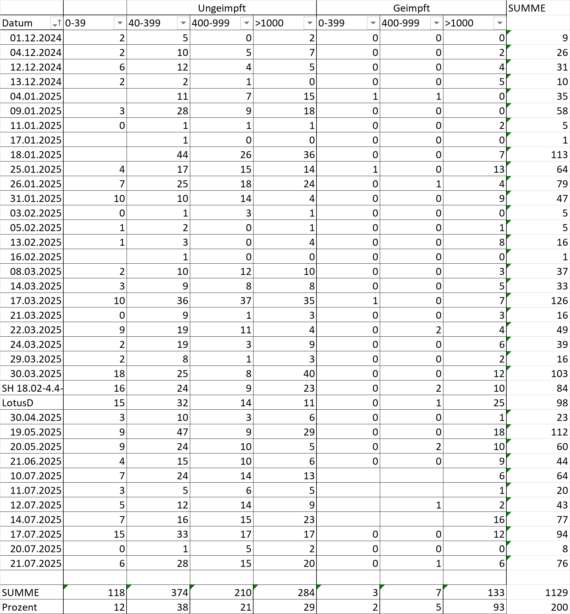 Sheddingopfer jedoch haben teilweise massiv erhöhte IgG Werte, teilweise >3000 BAU. Erste Sheddingsymptome können ab > ca. 700 BAU auftreten.