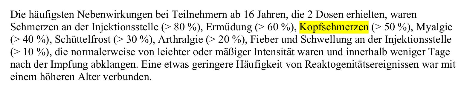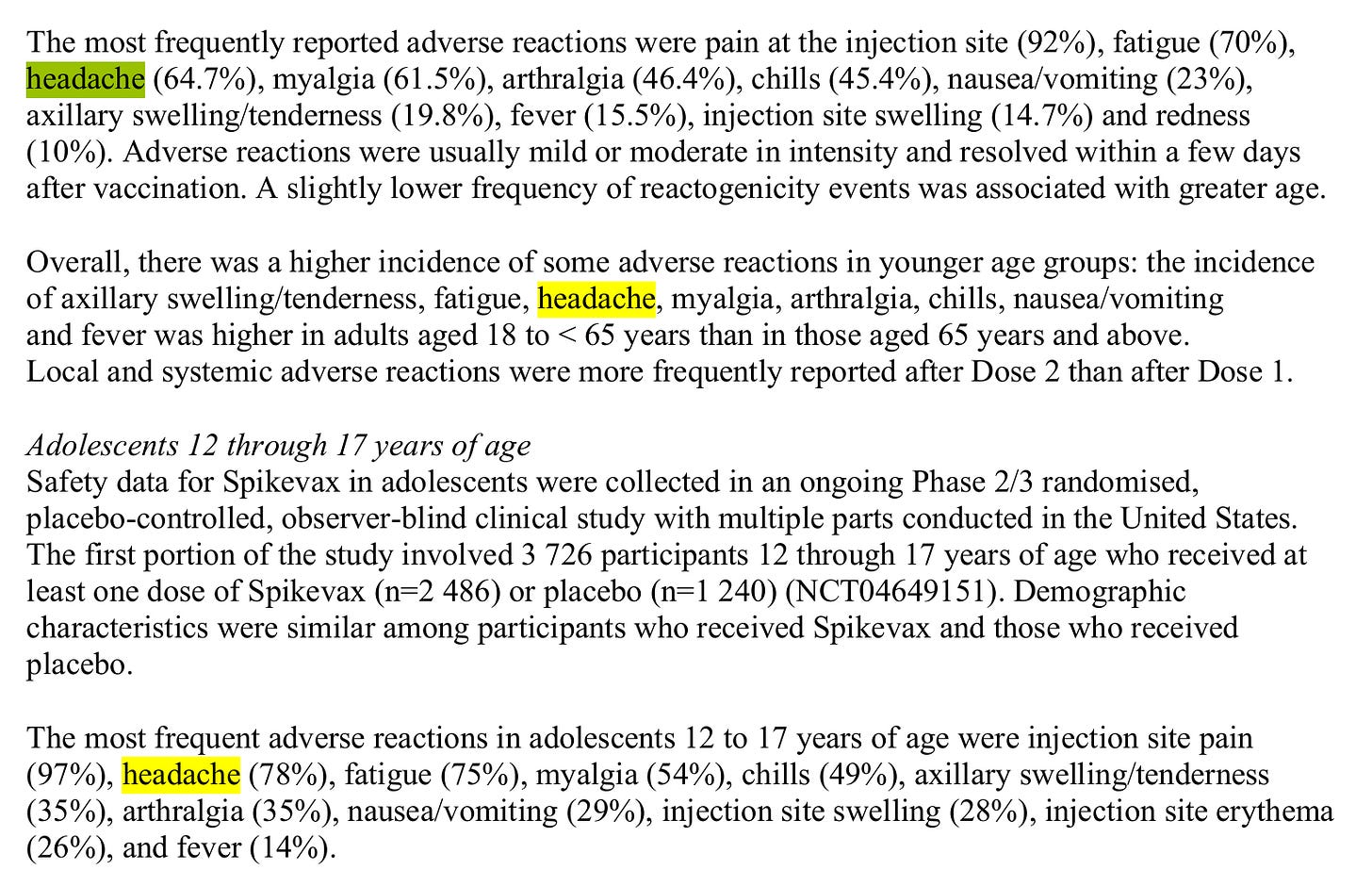 In der aktuellen Fachinformation von BioNTech Pfizers saisonalem COVID-Produkt stehen Kopfschmerzen (immer noch) als eine der häufigsten Nebenwirkung.